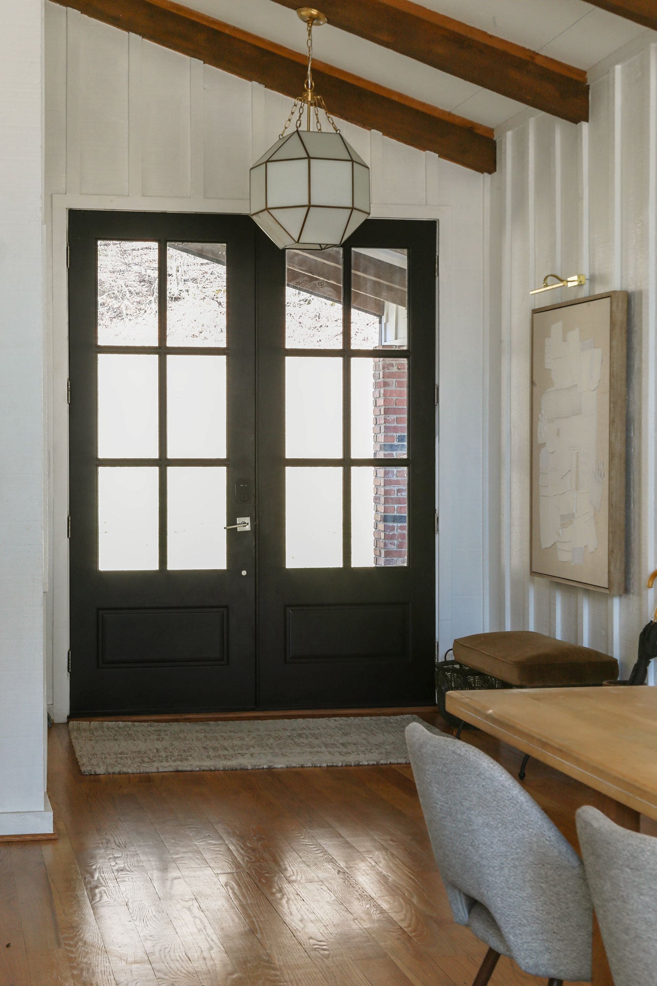 In my foyer and dining area, the walls are painted Shoji White by Sherwin Williams, and the space is filled with soft neutrals and warm wood tones. I wanted a little contrast and a strong visual anchor (without any weird undertones), which is exactly what Tricorn Black delivers on the front doors.