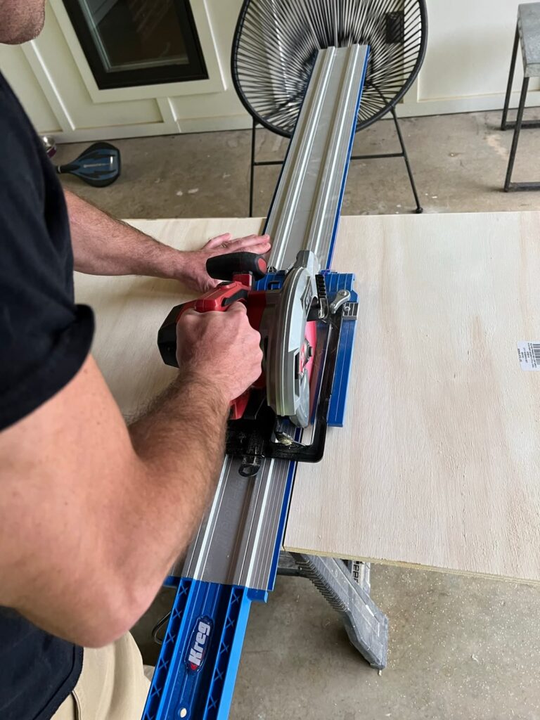 Using a circular saw on a Kreg track system (a $90 tool compared to a $600 router table), my husband quickly cut the slabs for our outdoor kitchen cabinets from plywood. We then used a Kreg concealed hinge jig to install the hinges to the box and voila! Simple as that!